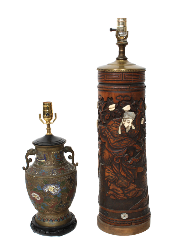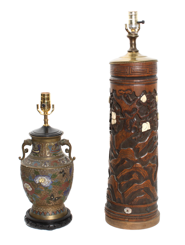of baluster form mounted with dragon shaped handles, fitted as a table lamp together with a carved cylindrical wood vase with bone and shell decoration, also fitted as a table lamp.