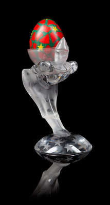 depicting a clown holding a composite egg, having Sevres Cristal France acid stamp.