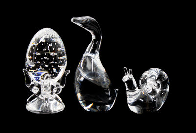 comprising a swan, snail and egg on stand, each signed Steuben.