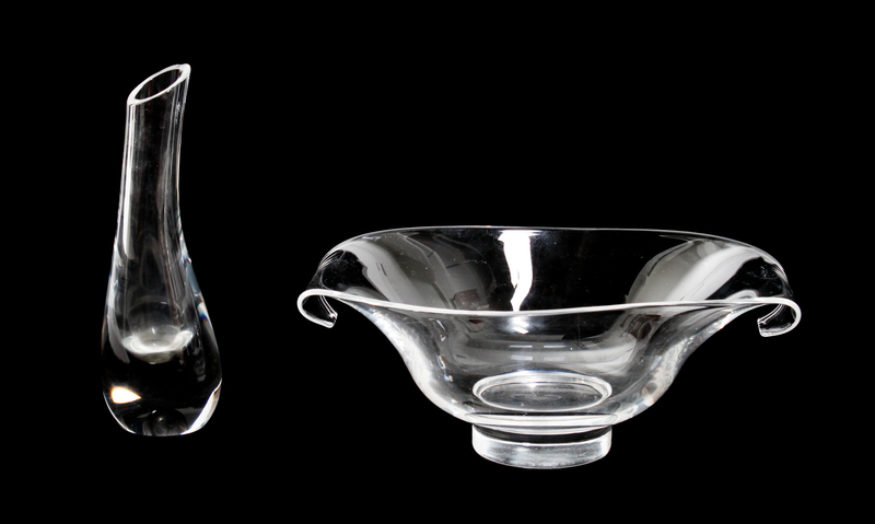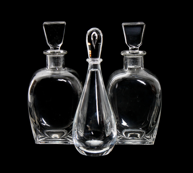 comprising a Baccarat crystal bud vase, a Steuben glass bowl, a Steuben glass decanter, and a pair of glass decanters. 5 total.