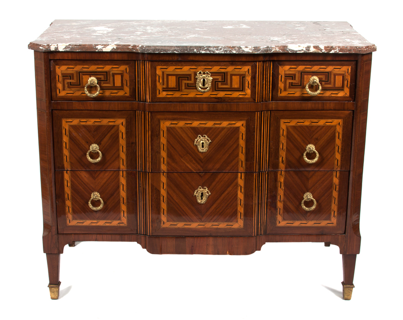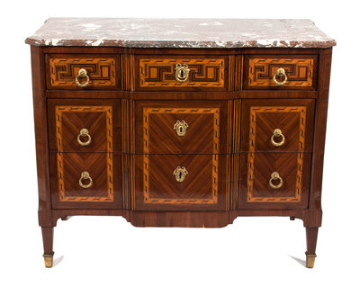 A Louis XVI Style Parquetry and Mahogany Commode