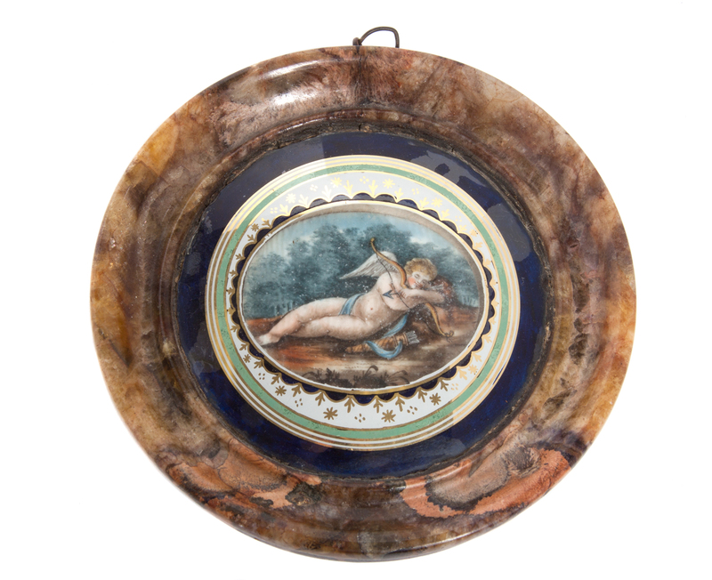 depicting a reclining cherub in a landscape, of circular form, having a reverse painted convex glass and stepped marble frame.