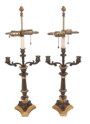 A Pair of Empire Gilt and Patinated Bronze Table Lamps