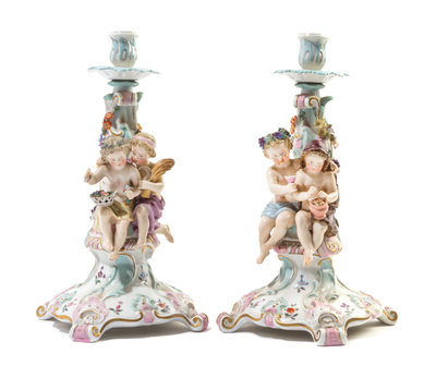 A Pair of Continental Porcelain Figural Candlesticks