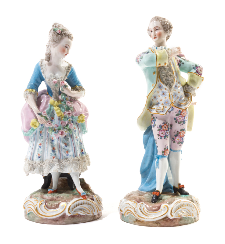 depicting a lady and a gentleman in period attire raised on rocaille bases.