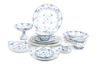in the Blue Fluted Full Lace pattern, comprising 15 dinner plates, 17 bread plates, 15 teacups, 17 saucers, 1 oval serving plate, 1 round serving plate, 2 round bowls, 2 compotes, 1 leaf-formed dish, and 1 open sugar bowl; together with two associated Lipper & Mann serving pieces in the Blue Fjord pattern, comprising a sauce boat and oval serving plate. 74 items total
