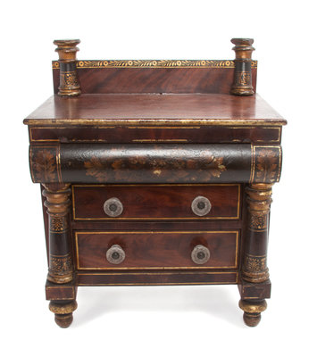 having a conforming drawer over two recessed drawers flanked by columns, surmounted by a columned backsplash, with painted and gilt foliate decoration, raised on turned feet.