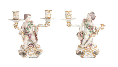 A Pair of Chelsea Porcelain Figural Two-Light Candlesticks