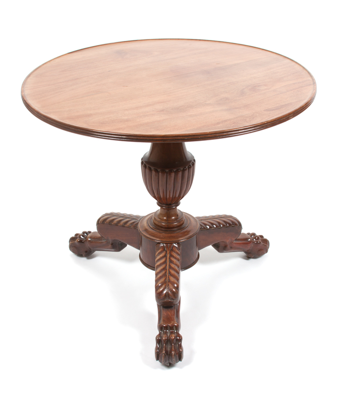 having a circular top raised on a baluster support and tripod base ending in claw and ball feet.
