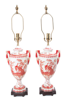 depicting peacocks and birds in a landscape, of baluster form with applied handles.