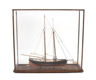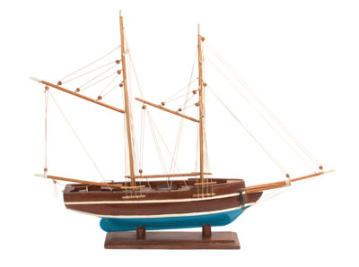one a model of a two mast sailing ship on stand, the other a model of a two mast sailing ship in custom box.