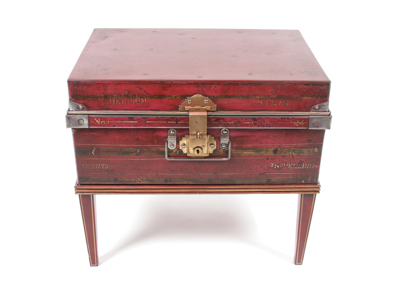 the hinged lid opening to a vacant interior having a mounted mirror and removable fitted tray, with an associated stand.