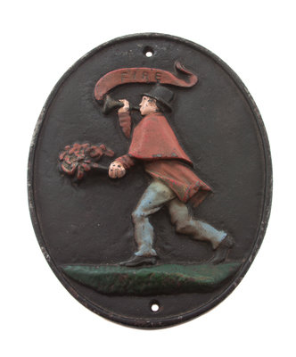 of oval form, the painted casting depicting a cloaked fire marshal carrying a torch and blowing a horn issuing a banner reading "Fire".