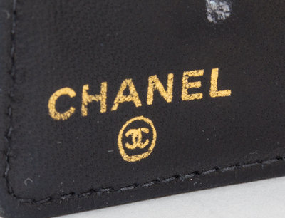 with goldtone hardware, a tonal stitched logo, black leather interior lining, an interior change purse, six card slots and three bill compartments.Stamped: Chanel.