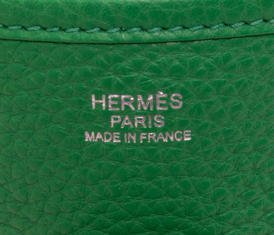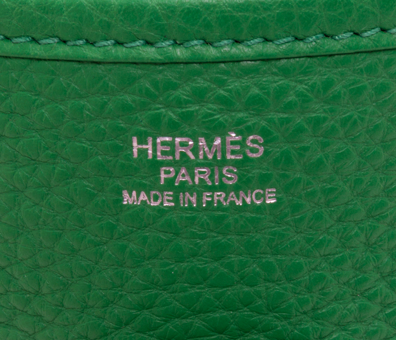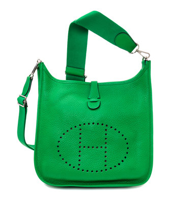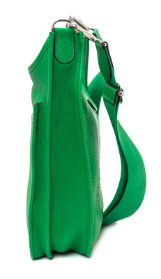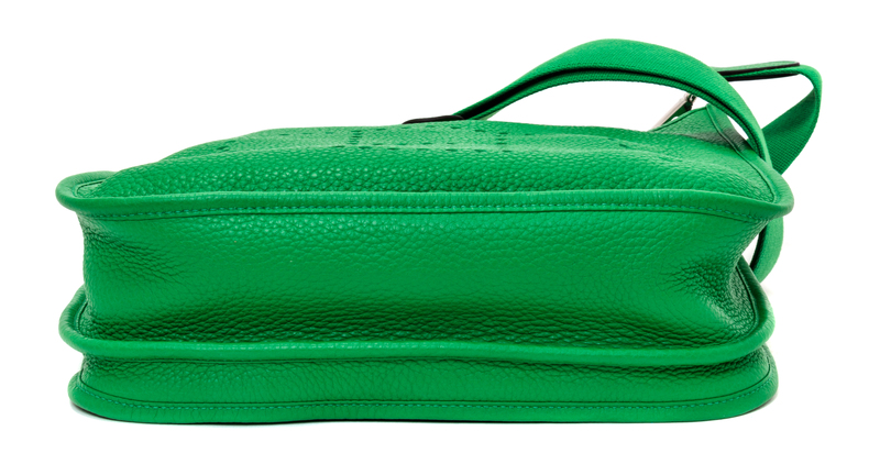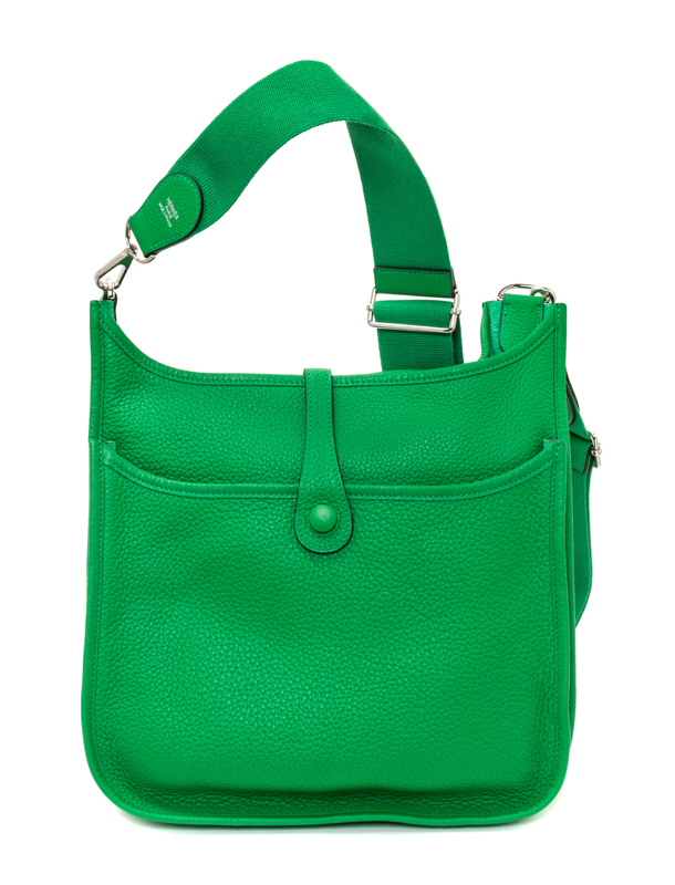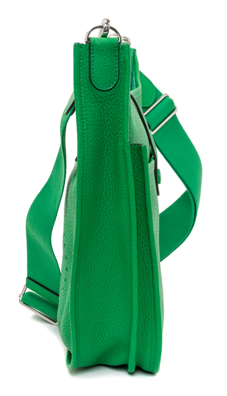 with silver and palladium hardware, unlined, an outside slip pocket, a leather tab closure, a perforated leather H plaque and an adjustable canvas and leather strap.Stamped: Hermes.
