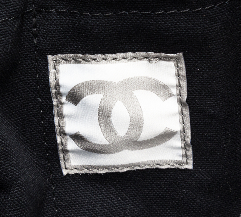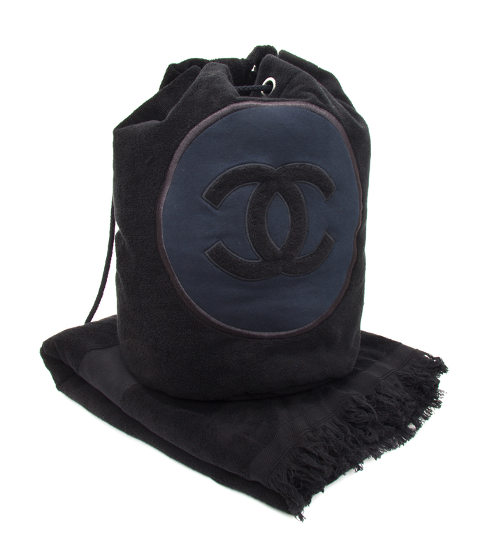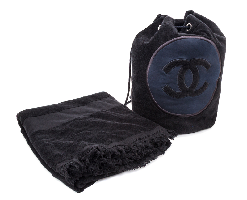 with silvertone hardware, a front raised CC logo and two small interior pockets. Together with a matching black terry cloth beach towel (70" x 60") with a tonal logo.Stamped: Chanel.
