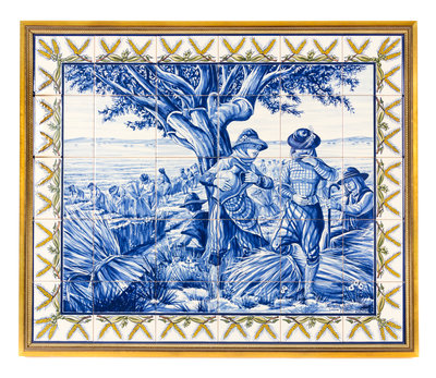 depicting peasants cutting wheat in blue and white glaze within a wheat decorated border, inscribed Casa Algarve Atelier, Angela, Helena, Ferreira, S. Mamede and Mobarral.