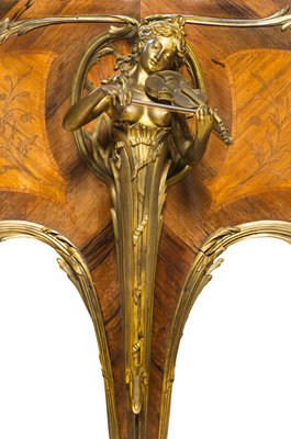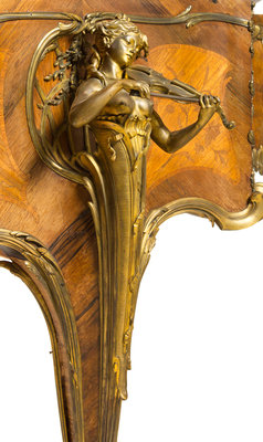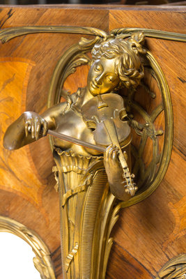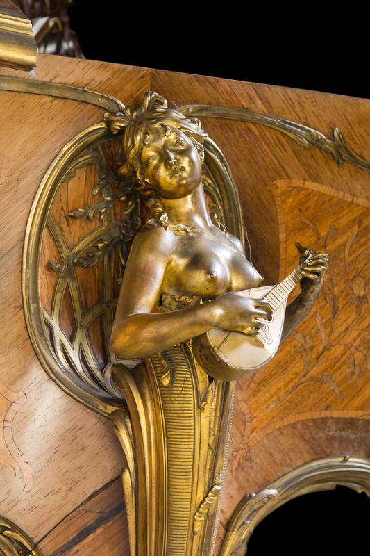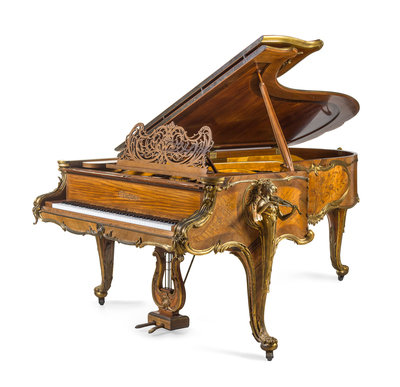 in the Louis XV taste, having a pierced fretwork music rack and foliate scroll mounts throughout, the case inlaid to show bouquets of flowers and raised on three cabriole legs headed by gilt bronze figures of ladies playing the violin, lute and harp, the legs ending in paw feet set on casters, model no. 4A, numbered 55548.