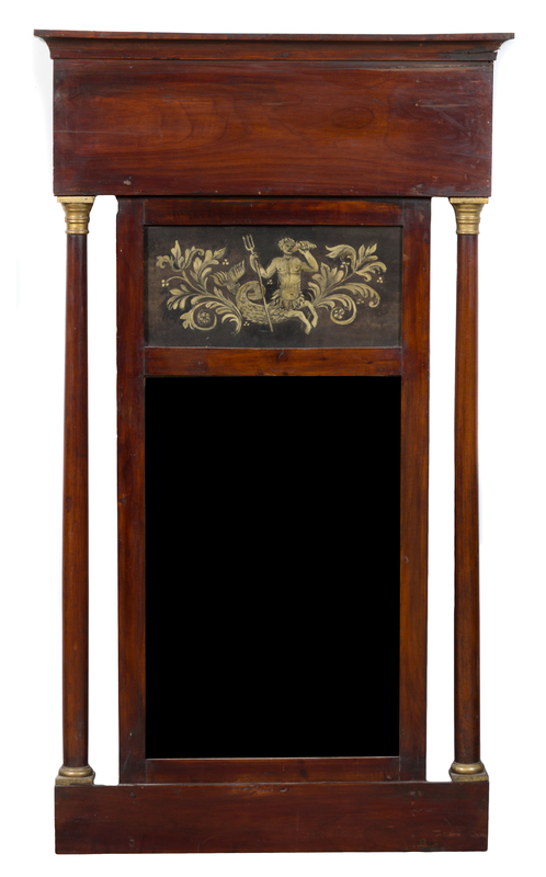 having a projecting molded cornice above a plain frieze, set with a rectangular mirror plate flanked by columnar supports.