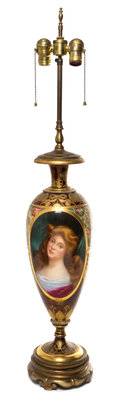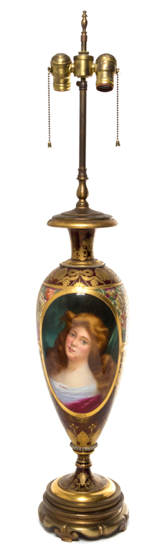 of baluster form, painted with an oval reserve depicting a lady with red hair against a claret ground with gilt highlights, mounted as a lamp.
