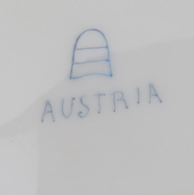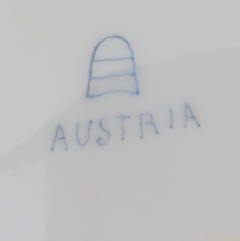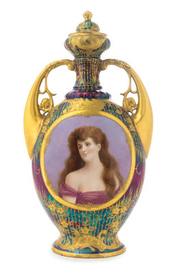 of ovoid form with applied openworked gilt handles, painted with a portrait of a lady on an iridescent ground with gilt highlights, the underside marked AUSTRIA with a beehive mark in underglaze blue.