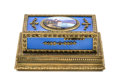 the lid with an enameled plaque depicting a landscape, with engine turned surfaces throughout.
