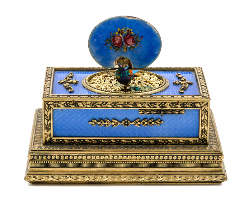 A Swiss Gilt Bronze and Guilloche Enamel Singing Bird Automaton Box