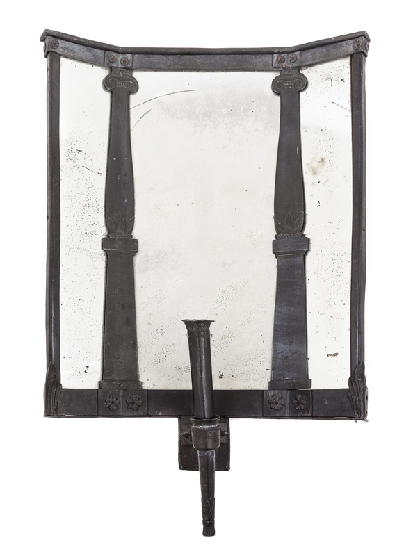 having three mirror panels separated by pilasters, issuing a torch form candlestick.