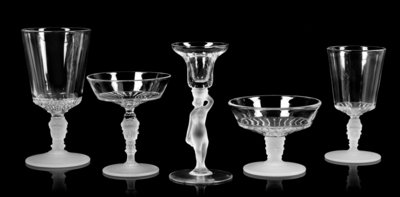 the stems decorated with female masks, comprising two water goblets, eight wine glasses, ten sherbet glasses, two champagne coupes, two shakers and an associated cordial with a frosted caryatid stem; 25 items total.