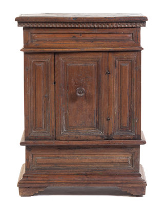 the molded rectangular top opening to a vacant interior above a central cupboard door enclosing a shelved interior, raised on bracket feet.