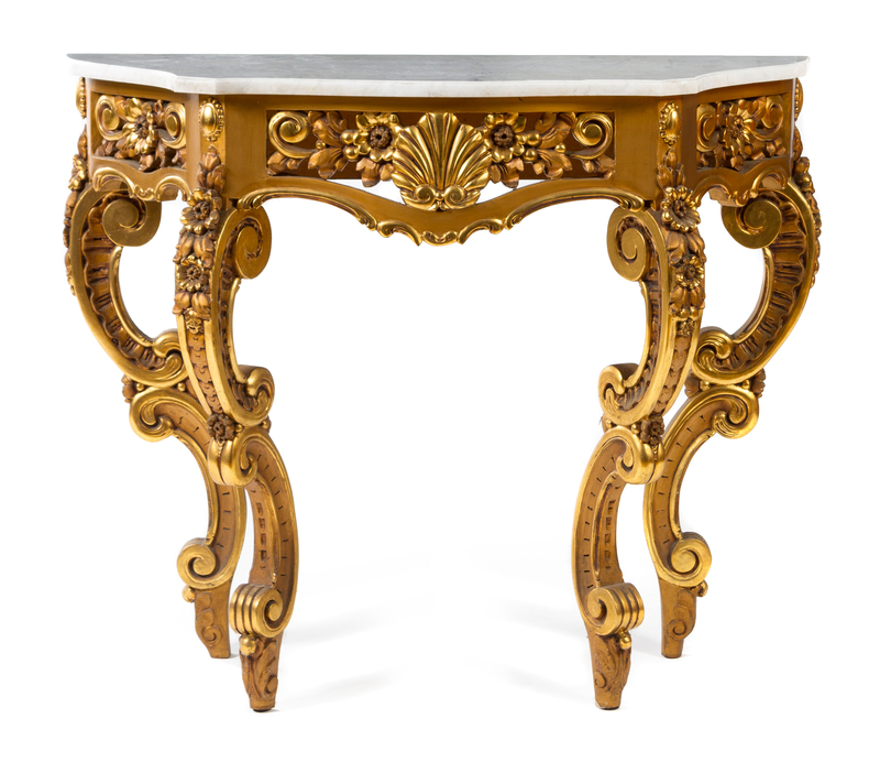 with a shaped white marble top over a pierce carved frieze, raised on cabriole legs formed by C-scrolls.