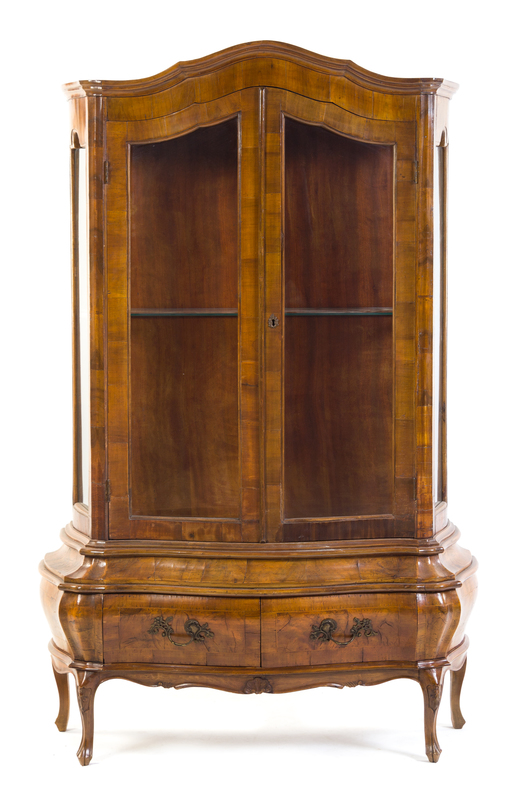 the arched and molded cornice above twin glazed doors opening to a shelved interior, over two short drawers, raised on short cabriole legs.