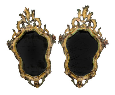 each of cartouche form with a floral painted frame, a pierced foliate crest and a candle stand at the base, with older or original glass mirror plates.