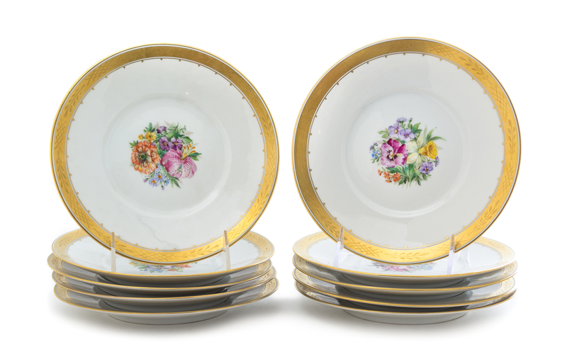 each decorated with a gilt rim and centered by a polychrome floral spray.