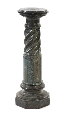 the circular top over a spiral twist fluted and lappet carved support, raised on an octagonal base.