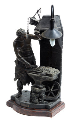 in the form of a blacksmith working at the furnace and hammering an anvil, bearing a foundry mark to the base.