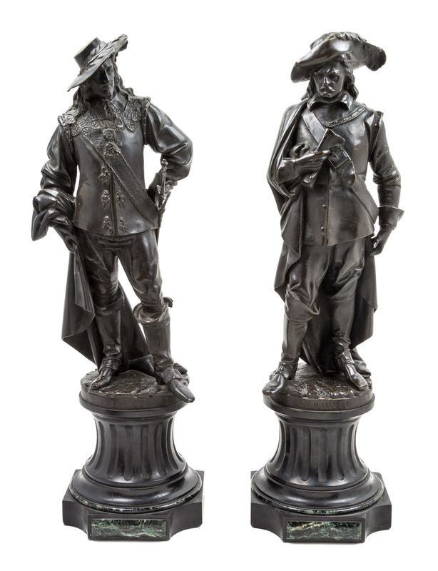depicting King Charles I and Oliver Cromwell, each figure standing on a naturalistic circular base and a stepped marble pedestal.