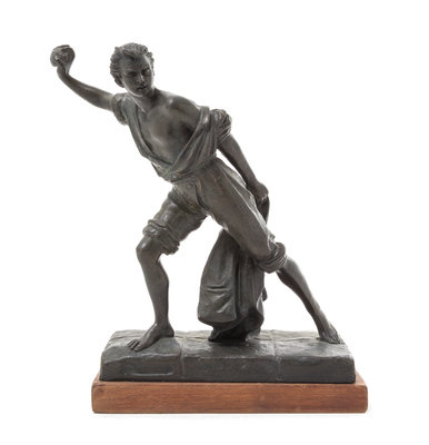 depicting a man throwing a rock, with an illegible foundry mark to the base, raised on a rectangular wood plinth.