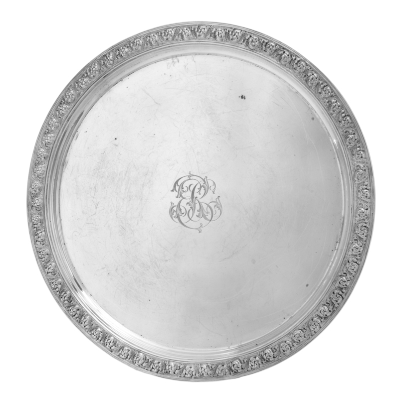 of circular form, with a foliate scroll border and a script monogram at the center, raised on four winged paw feet.