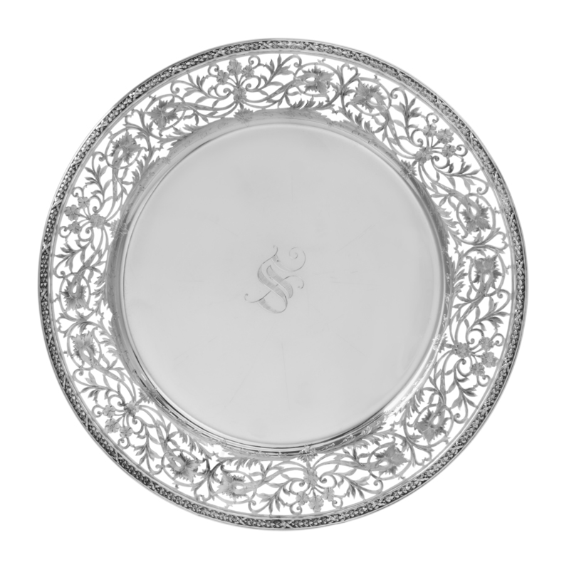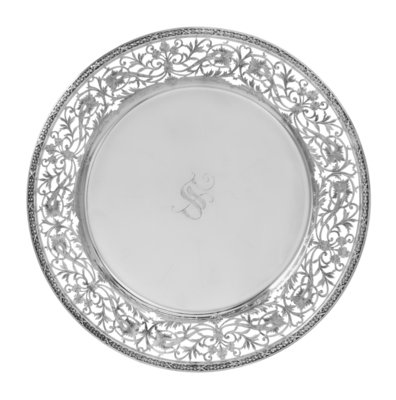 having a foliate swag decorated rim surrounding a pierced floral and foliate border and centered by the monogram S.