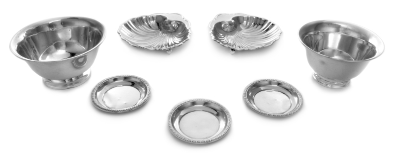 comprising a Towle Silversmiths Revere bowl, a F.B. Rogers Silver Co. Revere bowl, two shell form dishes and three ash receivers.