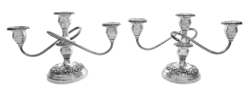 having reeded arms supporting baluster form cups with floral banded rims, raised on a similarly decorated base, weighted.