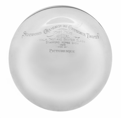the interior with the engraved inscription Stamford Chamber of Commerce Trophy/ First Prize/ Special/ Walk, Trot and Canter Class/ Stamford Horse Show/ 1929/ Won by/ Picturesque, raised on scroll feet.