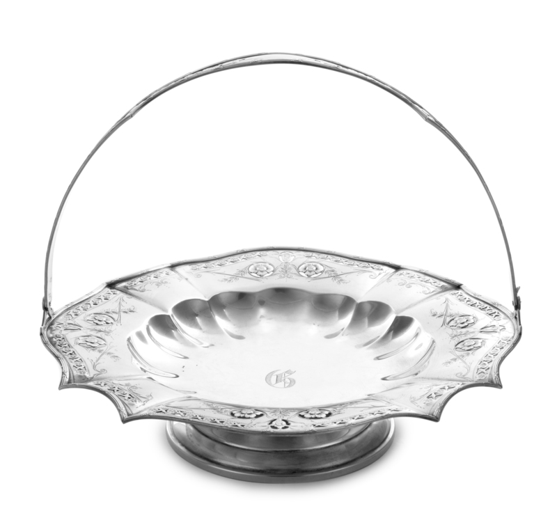 having a tied reed border and a pierced floral and lattice decorated rim and handle, centered with the engraved monogram G.