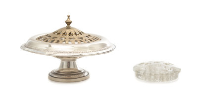 having a floral and foliate decorated border and foot and an associated pierce decorated lid, weighted, together with a glass flower frog.