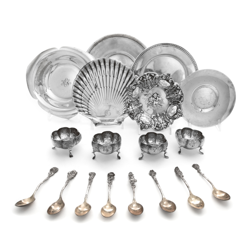 comprising eight demitasse spoons having floral decorated handles, Reed & Barton, four British footed salts having lobed bodies with spot hammered decoration, and six American dishes of various forms; 18 items total.