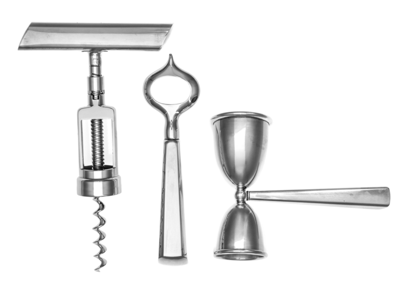 comprising a corkscrew, a bottle opener and a double jigger, with a fitted box.