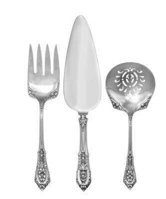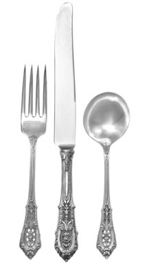 Rose Point pattern, comprising:12 dinner knives12 butter spreaders12 dinner forks12 salad forks12 dessert forks12 teaspoons12 soup spoons12 fruit spoons1 lemon fork1 sugar spoon1 sauce ladle1 pierced serving spoon1 cold-meat fork1 master butter knife1 cake server