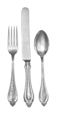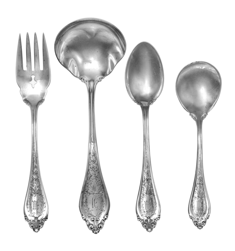Old Newberry pattern, comprising: 12 dinner forks12 luncheon forks 12 salad forks 12 teaspoons 12 tablespoons 12 bouillon spoons 12 dinner knives12 luncheon knives1 sauce ladle