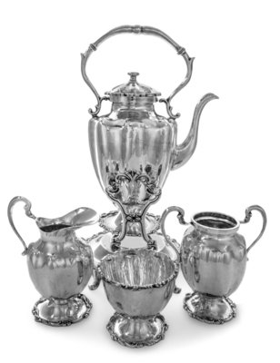 comprising a kettle on stand, a creamer, a sugar and a waste bowl, each having a lobed body with foliate decorated rims.